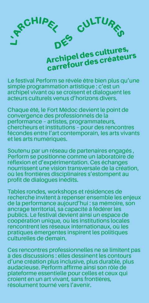 Directrice artistique de la compagnie Winter story in the wild jungle, l’artiste Sarah Trouche vit et travaille entre Saint Laurent du Médoc et Paris. Avec le festival Perform, elle fait découvrir chaque été son univers artistique aux habitants de sa région d’enfance. La performance est considérée par l’artiste comme un espace de rencontre, un partage d’émotion autour d’un moment unique. Cette dimension performative apparaît dans une programmation d’envergure nationale et internationale qui couvre à la fois les champs de l’art contemporain, des arts numériques et des arts vivants.